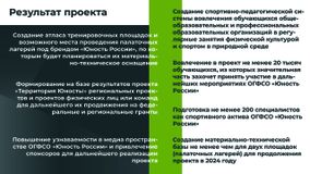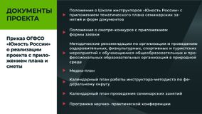 В рамках Федерального проекта "Спорт - норма жизни" проводятся мероприятия в рамках проекта "Территория Юность!». Программа семинарских и практических занятий для специалистов осуществляющих организацию оздоровительной, физкультурной и спортивной деятельности в условиях природной среды. А также организован Всероссийский смотр - конкурс на лучшую постановку физкультурно - спортивной деятельности в природной среде.